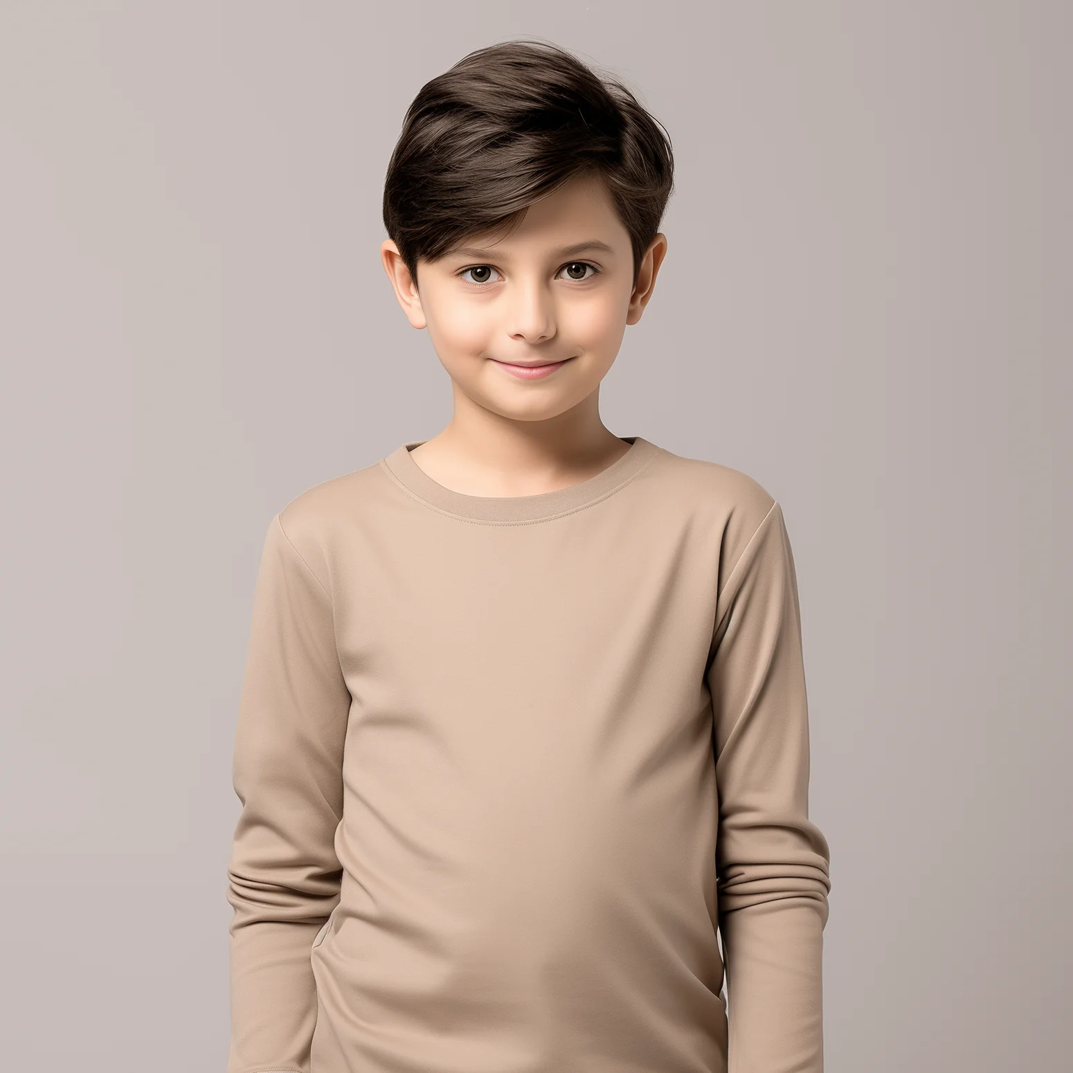 Comfortable, warm, and effortlessly stylish—this Boys Round Neck Top in Beige is a perfect winter wardrobe essential. Made from premium C91 Interlock fabric, it offers exceptional softness, cozy warmth, and a smooth stretch that keeps him comfortable all day long.