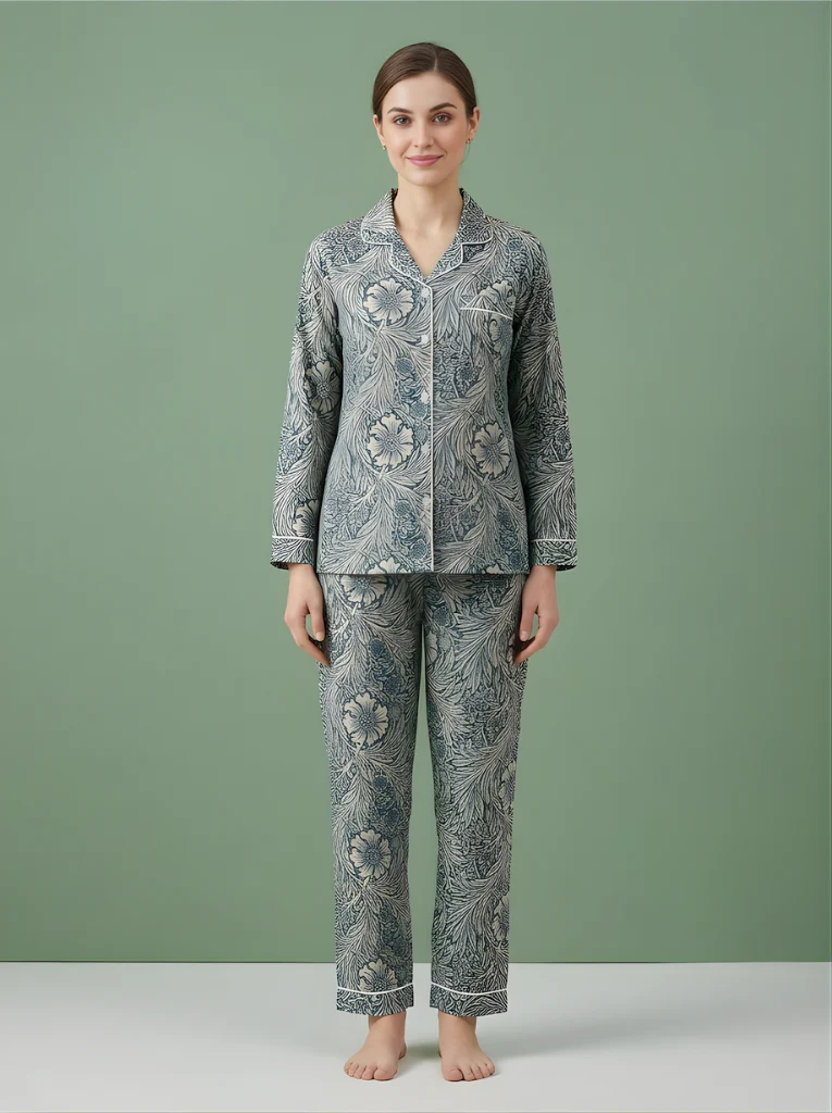 Step into a world of quiet elegance with our Heritage Botanical Pajama Set. This set features an intricate, all-over floral print reminiscent of classic woodblock artistry, rendered in a calming palette of slate blue and muted sage. It’s the perfect blend of vintage charm and modern comfort.